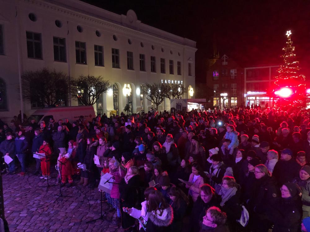 Mehr als 500 Bürgerinnen und Bürger kamen am Abend des 3. Advent auf den Oldesloer Marktplatz um gemeinsam Weihnachtslieder zu singen.